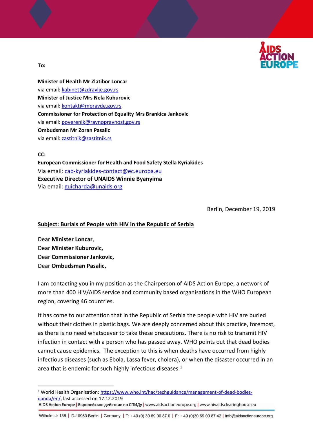 Branislav Princip from the NGO Nova+, adds "Everyone has the right to a dignified funeral and with such an interpretation of the regulation, human rights of PLHIV are threatened. HIV status of a person is made public posthumously. My organization and other PLHIV activists in Serbia hope that this Regulation will be removed as soon as possible and we are grateful to AAE for their involvement and support."