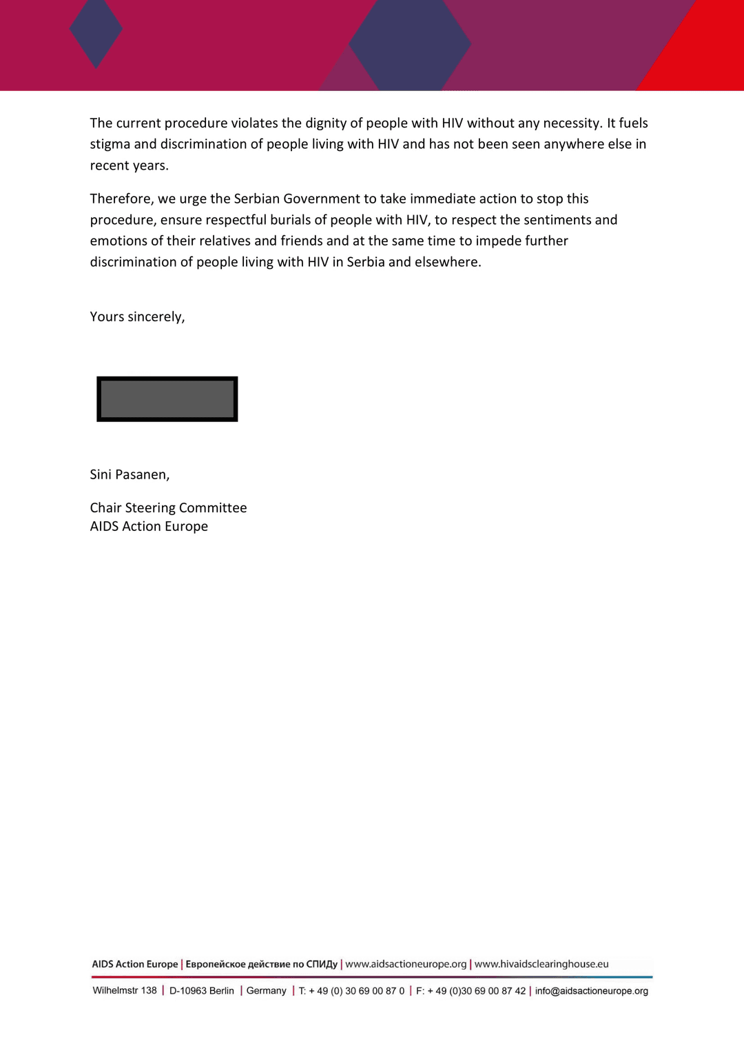 In a letter (see below) to the Serbian Minister of Health, the Minister of Justice, the Commissioner for Protection of Equality and to the respective Ombudsman, AAE called on stopping this practice immediately since there is no need for taking this precaution and it unnecessarily fuels HIV related discrimination and stigma.